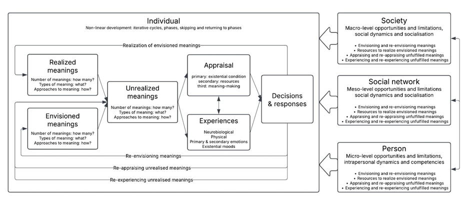 Within each phase, the model examines how an individual envisions a meaningful life and world, how they try to realise this, and how they experience, appraise and respond to unrealised meanings, under influence from society, social networks, and personal circumstances. As individuals may experience repeated failure to realize the meaningful life and world they had envisioned, they may shift towards using more radical methods to realize their meanings, develop more radical envisioned meanings, and radicalise reappraise the cause and solutions to their failures.